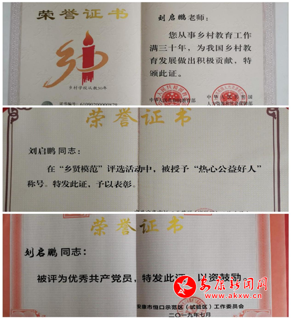 劉啟鵬先后獲得教育部、人力資源和社會(huì)保障部授予“鄉(xiāng)村學(xué)校從教30年”榮譽(yù)證書,被區(qū)鎮(zhèn)評(píng)為“鄉(xiāng)賢模范”和“優(yōu)秀共產(chǎn)黨員”等先進(jìn)個(gè)人。