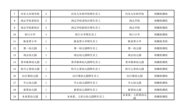 恒口示范區(qū)中心城區(qū)重點(diǎn)人群:一是黨政機(jī)關(guān)、企事業(yè)單位返崗人員、中小學(xué)校。幼兒園返校人員;二是“五一”假期有市域外旅居史人員;三是41類(lèi)重點(diǎn)人群;四是市域外來(lái)恒返恒核酸檢測(cè)結(jié)果超過(guò)48小時(shí)人員;五是愿檢人員。