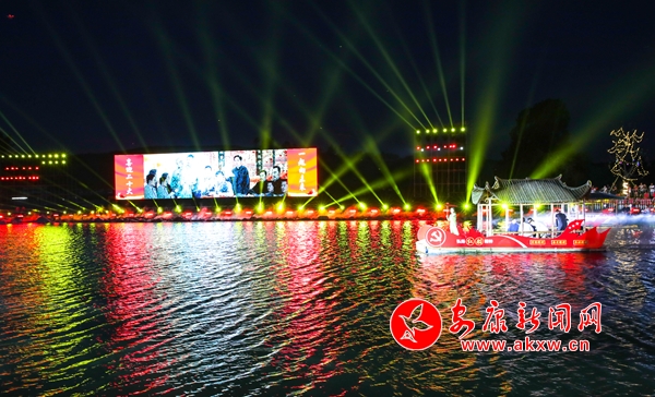 晚會在嘹亮激昂的獨(dú)唱《東方紅》中拉開序幕,緊接著,磅礴大氣的歌舞串燒《我和我的祖國》《萬疆》《愛我中華》,如詩如畫的水上表演《南湖紅船》《江南水鄉(xiāng)》《滾滾長江東逝水》,動力澎湃的RAP時尚秀《門戶新安康》,美輪美奐歌舞表演《我的深情為你守候》《為祖國干杯》《送你一個長安》《我愛你,中國》《領(lǐng)航》等節(jié)目相繼登臺表演,與此同時,絢麗多彩的燈光秀和仙氣飄飄的霧森特效穿插其中,不斷將演出推向高潮。最后,整場演出在大合唱《沒有共產(chǎn)黨就沒有新中國》的歌聲中圓滿落下帷幕。