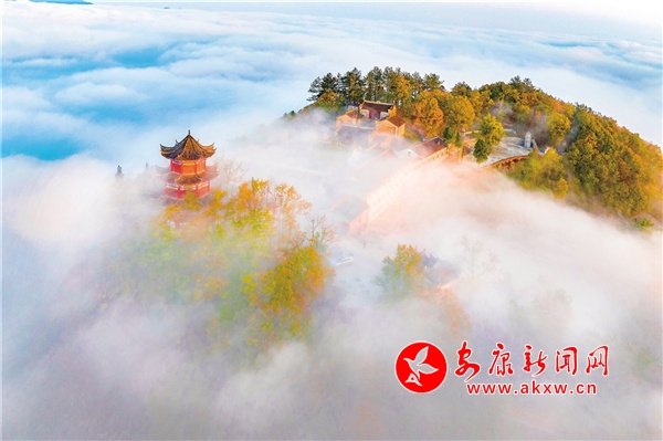 天柱山最美不過秋色,也是我在四季當中頻繁上山的季節(jié)。每逢秋天,這里紅黃綠相間,漫山掛彩,在藍天的映襯下,多了幾分浪漫。從國道211起點的兩條上山公路,由數(shù)個“之”字連接起來,從湖邊一直盤旋至山頂?shù)陌自乒潘?,遠眺仿佛一個大大的“人”字形飄帶。雨后放晴的頭兩個早晨,在云霧的籠罩下,天柱山的下半身連同湖面一并被巨大的“蠶絲被”覆蓋,山的上半身或山頭浮在云海之上,像是茫茫大海上的一座孤島。