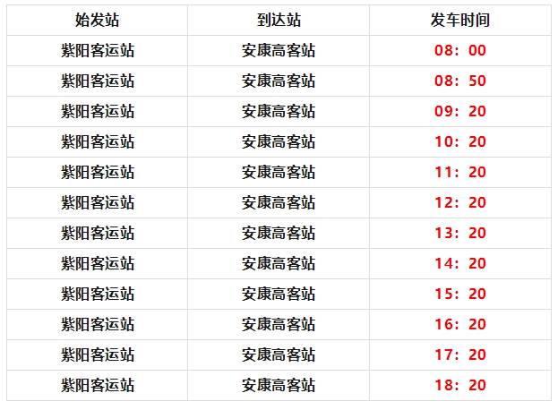 紫陽客運(yùn)站發(fā)往安康高速客運(yùn)站,每日12班,發(fā)車時(shí)間為: