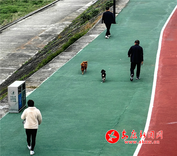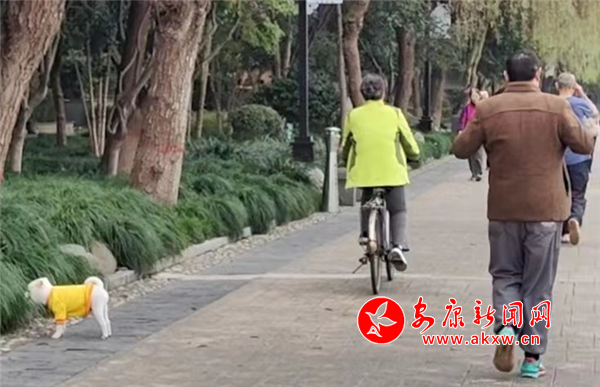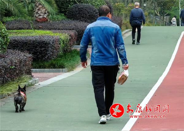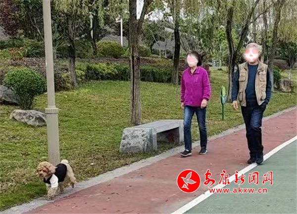 11月9日上午,漢江公園人行步道,有市民遛狗未牽繩。(圖文/馬歡)
