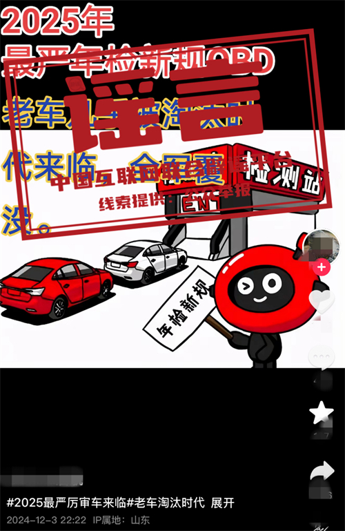 真相:近日,多個自媒體賬號發(fā)布消息,宣稱“史上最嚴(yán)車檢來了”“車檢年限變化”“燃油車年檢增加OBD檢測”等。中央廣電總臺中國之聲記者多方求證了解到,上述說法均為不實消息,目前各地車檢并沒有新變化。
