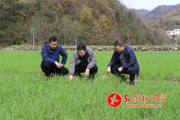 大河鎮(zhèn)先鋒社區(qū)第一書(shū)記馬鵬和市區(qū)農(nóng)技中心的專(zhuān)家在進(jìn)行冬小麥品種試驗(yàn)