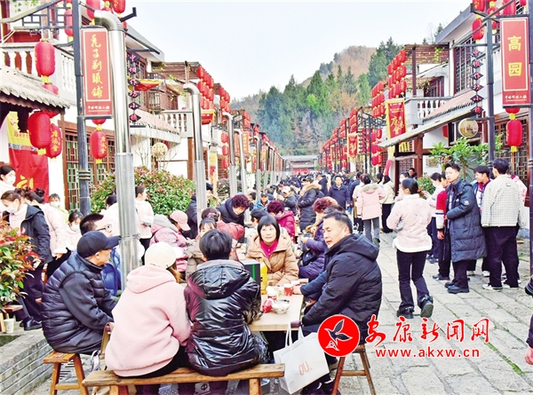 “開(kāi)席啰……”隨著一聲鑼響,充滿儀式感的省級(jí)非遺庖湯盛宴正式開(kāi)始。古色古香的店鋪門(mén)頭掛滿紅燈籠,石板鋪成的長(zhǎng)街上,賓客8人一桌圍爐而坐,道道美食依次上席,說(shuō)菜人“口吐蓮花”,菜越說(shuō)越香;酒歌高亢,越喝越暖;猜拳行令,秦巴漢子盡顯豪邁風(fēng)采;作坊小鎮(zhèn)高朋滿座,滿滿年味十里香飄。