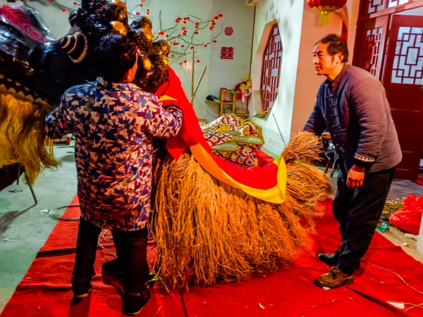 2月1日,大年初四,大家還沉浸在新年快樂中。喧天彩排鑼鼓一敲,嘹亮嗩吶一響,在雙河鎮(zhèn)政府的號(hào)召下,李忠寶帶著一群表演經(jīng)驗(yàn)豐富的文藝骨干、朝氣蓬勃的青年學(xué)生,換上演出行頭,帶著自制的花燈道具,開始李氏花燈游演排練。在現(xiàn)場,彩色中國龍游動(dòng)、翻滾、盤踞,不停地變換著花樣;獅子騰躍、回旋、直立,時(shí)而威風(fēng)凜凜、時(shí)而憨態(tài)可掬……