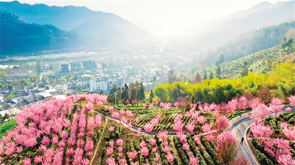 沿著茶山步道拾級而上,茶農(nóng)采青的竹簍與游人拍照的紗巾在梯田間次第閃現(xiàn)。粉白相間的梅花如云絮般綴滿枝頭,風過處,花瓣簌簌落入茶叢,為嫩綠的新芽染上淡淡馨香。遠處黛瓦白墻的徽派民居與近處起伏的茶壟構(gòu)成天然畫框,無人機視角下,蜿蜒的茶道如同玉帶纏繞山腰,將紅楓、櫻花、梅林串成斑斕的珠鏈。