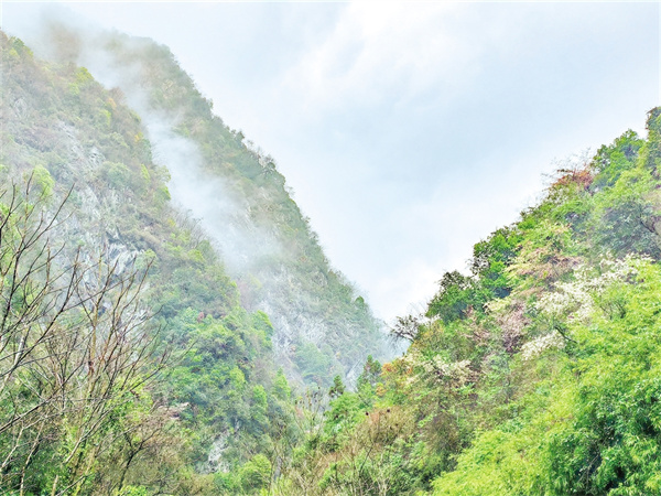 謝坪的茶園已經(jīng)開園,走進(jìn)郁郁蔥蔥的茶田,露水在新抽的芽尖上凝成珠串,鮮翠欲滴。勤勞的采茶人趁著雨停正在采茶,手指翻飛間竹簍里的鮮葉便堆得冒尖,溢出淡淡的茶葉清香。抬頭看去,半山腰的野櫻花也從巖縫里斜斜地探出來(lái),粉白的花瓣在淡淡云霧的映襯下顯得更加鮮艷,偶有一道陽(yáng)光穿透云層,將櫻花染成半透明的緋色,整座山坡便成了流動(dòng)的云霞。