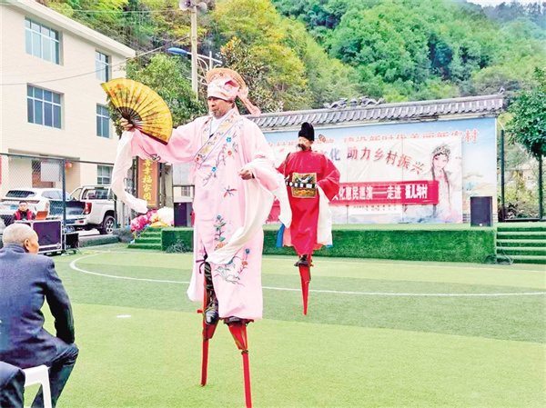 在五峰村,村支部書(shū)記羅仁春告訴記者,2023年村委會(huì)牽頭成立了五峰村文化民俗文藝協(xié)會(huì),陸續(xù)加入的48名會(huì)員涵蓋老中青三代,既有傳承高蹺絕技的老人,也有主動(dòng)學(xué)習(xí)弦子腔的年青一代。今年32歲的村民小梅加入?yún)f(xié)會(huì)后,一改往日下班后悶在家中的狀態(tài),每天下午吃完飯都會(huì)下樓和新認(rèn)識(shí)的姐妹載歌載舞,很快就成為舞蹈隊(duì)的主力?!耙郧安恢牢覀兇迳线€有文藝協(xié)會(huì),自從村上干部告訴我后,我就趕緊加入了這個(gè)小團(tuán)體,既鍛煉了身體,又愉悅了心情,生活幸福感越來(lái)越強(qiáng)烈?!鄙碇璧阜男∶飞碜随鼓?,水袖飛揚(yáng)間,明媚的笑容如花一樣燦爛。