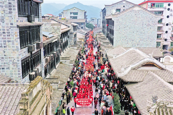 一縷微風(fēng)穿過,黃昏的老街各種顏色交織碰撞,給人無限遐想。街道兩旁,店鋪一家挨著一家,幾家店外排著長隊,生意火爆。漢服、旗袍走秀、火獅子、舞龍、漢調(diào)二黃、花鼓戲入眼入耳?;秀遍g,昔日的場景猶如一幅畫卷徐徐展開。