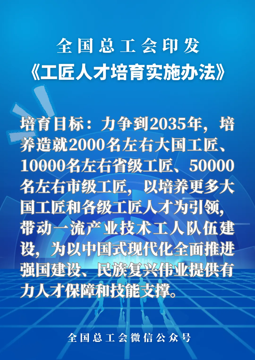 第二條 培育目標(biāo)是,力爭到2035年,培養(yǎng)造就2000名左右大國工匠、10000名左右省級(jí)工匠、50000名左右市級(jí)工匠,以培養(yǎng)更多大國工匠和各級(jí)工匠人才為引領(lǐng),帶動(dòng)一流產(chǎn)業(yè)技術(shù)工人隊(duì)伍建設(shè),為以中國式現(xiàn)代化全面推進(jìn)強(qiáng)國建設(shè)、民族復(fù)興偉業(yè)提供有力人才保障和技能支撐。