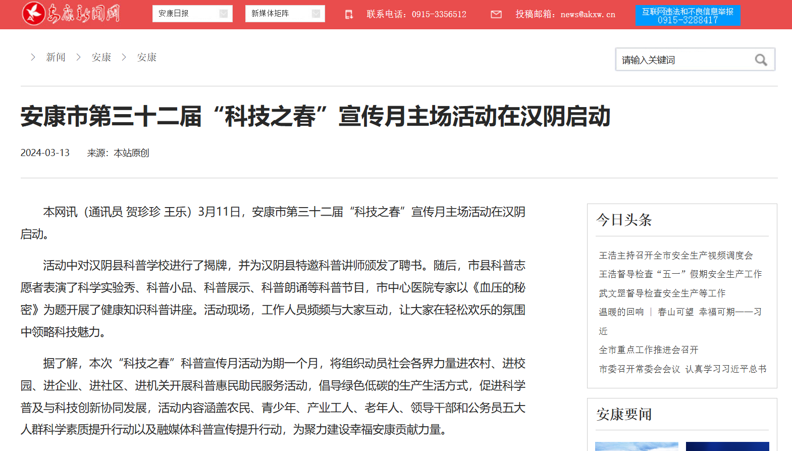 黨的二十大報告指出,培育創(chuàng)新文化,弘揚科學(xué)家精神,涵養(yǎng)優(yōu)良學(xué)風(fēng),營造創(chuàng)新氛圍。為推動全民科學(xué)素質(zhì)全面提升,鼓勵全社會關(guān)注科學(xué)創(chuàng)新,形成崇尚科學(xué)的良好氛圍,安康新聞網(wǎng)通過“全國科普日集中宣傳”等主題宣傳,持續(xù)發(fā)布一系列民生科普報道,切實增強科學(xué)知識在群眾中的普及率,取到了良好的社會效果。