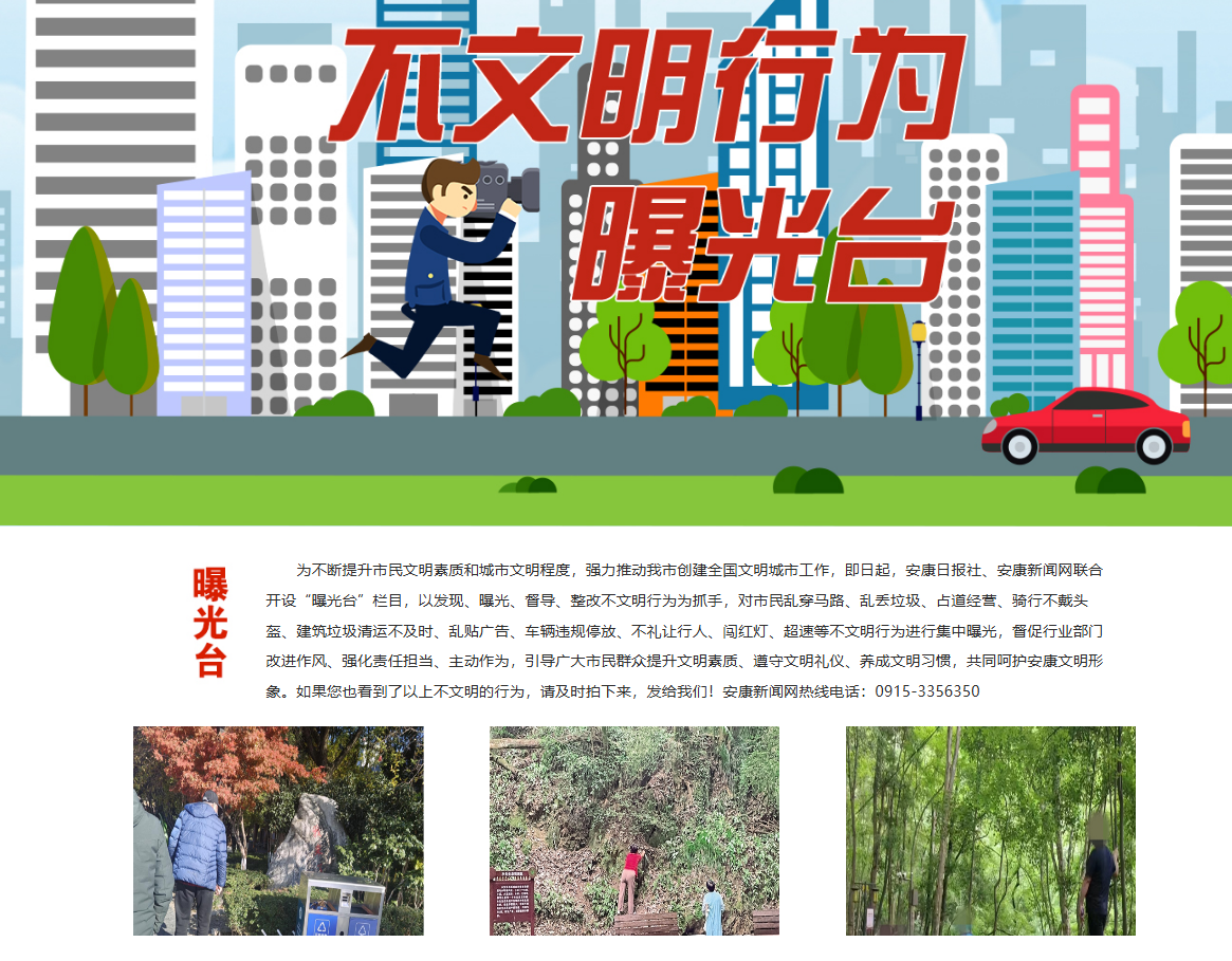 安康新聞網(wǎng)繼續(xù)充分發(fā)揮輿情監(jiān)測和輿論監(jiān)督作用,以高度負責(zé)的態(tài)度,及時監(jiān)測上報重大輿情信息。開設(shè)《不文明行為曝光臺》輿論監(jiān)督專欄,集中曝光身邊的不文明現(xiàn)象、行為,發(fā)布消息報道19篇,引導(dǎo)市民群眾自覺規(guī)范文明行為,主動融入城市文明創(chuàng)建熱潮,為提升市民文明素質(zhì)和城市文明程度貢獻媒體力量,體現(xiàn)地方黨媒的責(zé)任與擔(dān)當(dāng)。