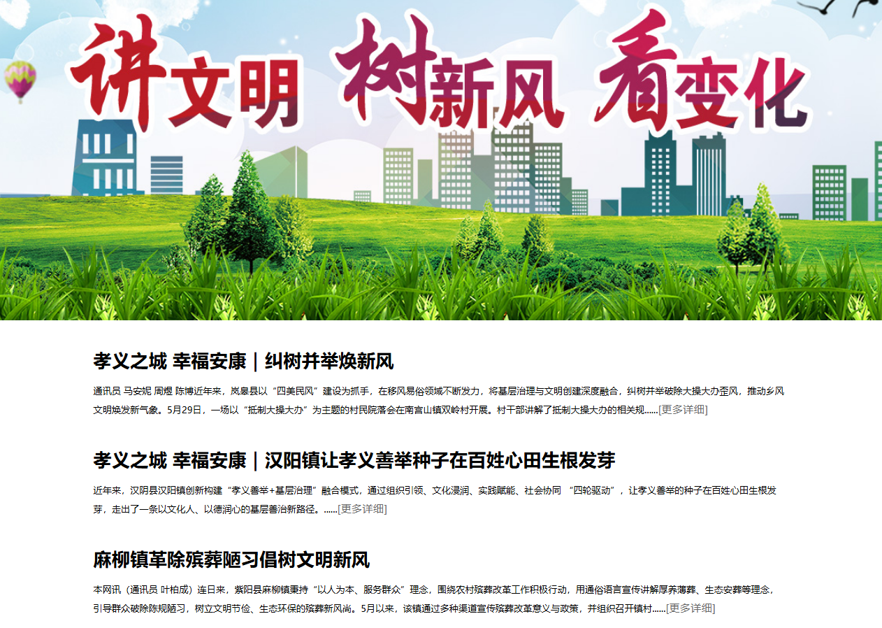 自覺承擔(dān)起舉旗幟、聚民心、育新人、興文化、展形象的使命任務(wù)。堅持以人為本,體現(xiàn)人文關(guān)懷,關(guān)注民生問題,反映群眾意見呼聲。發(fā)布了《孝義暖綠都 善舉聚人心——寧陜縣推進孝義善舉培育工程側(cè)記》《白河開展集中整治讓“煙火氣”添“文明味”》《八仙鎮(zhèn)鞏固農(nóng)村人居環(huán)境整治成果》等一批代表性稿件。