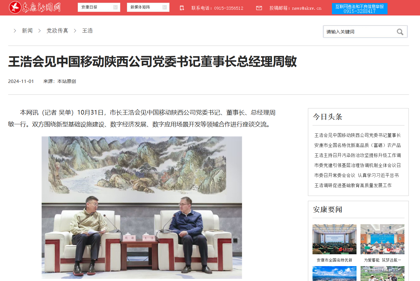 《王浩會見中國移動陜西公司黨委書記董事長總經(jīng)理周敏》(2024-11-01發(fā)布)