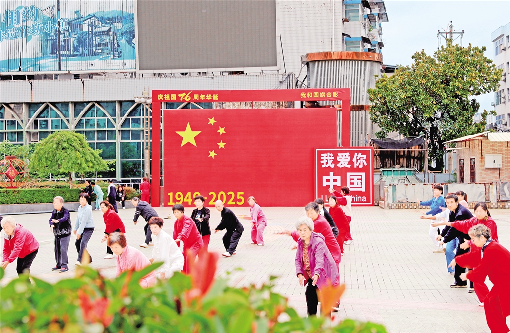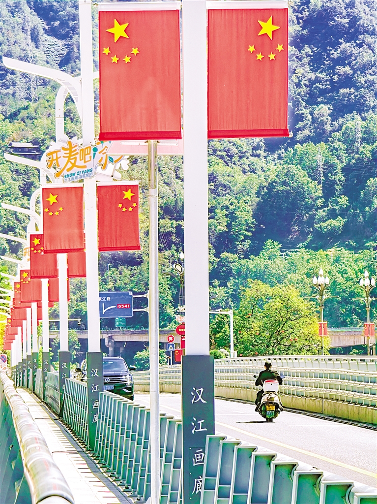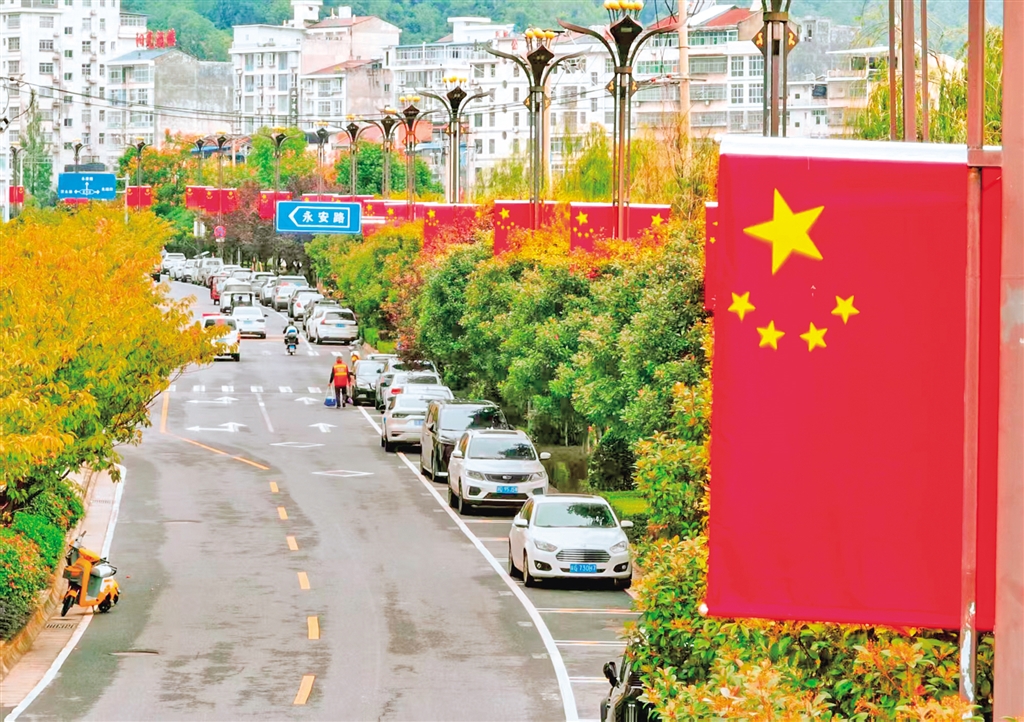 紫陽(yáng)城區(qū)的街頭巷尾,一面面鮮艷的五星紅旗迎風(fēng)招展,處處洋溢著祥和的節(jié)日氛圍。?葉明星 攝