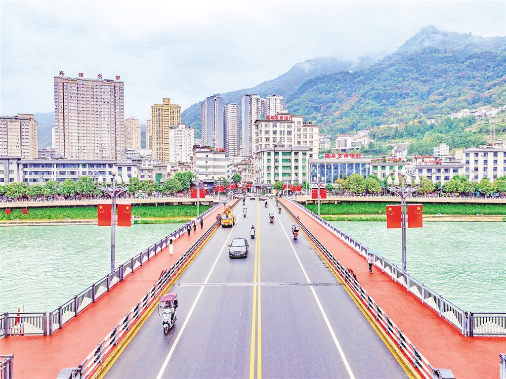 在嵐皋縣大橋兩側(cè),一面面整齊的五星紅旗迎風(fēng)飄揚(yáng),喜迎國(guó)慶。?李王灝 攝