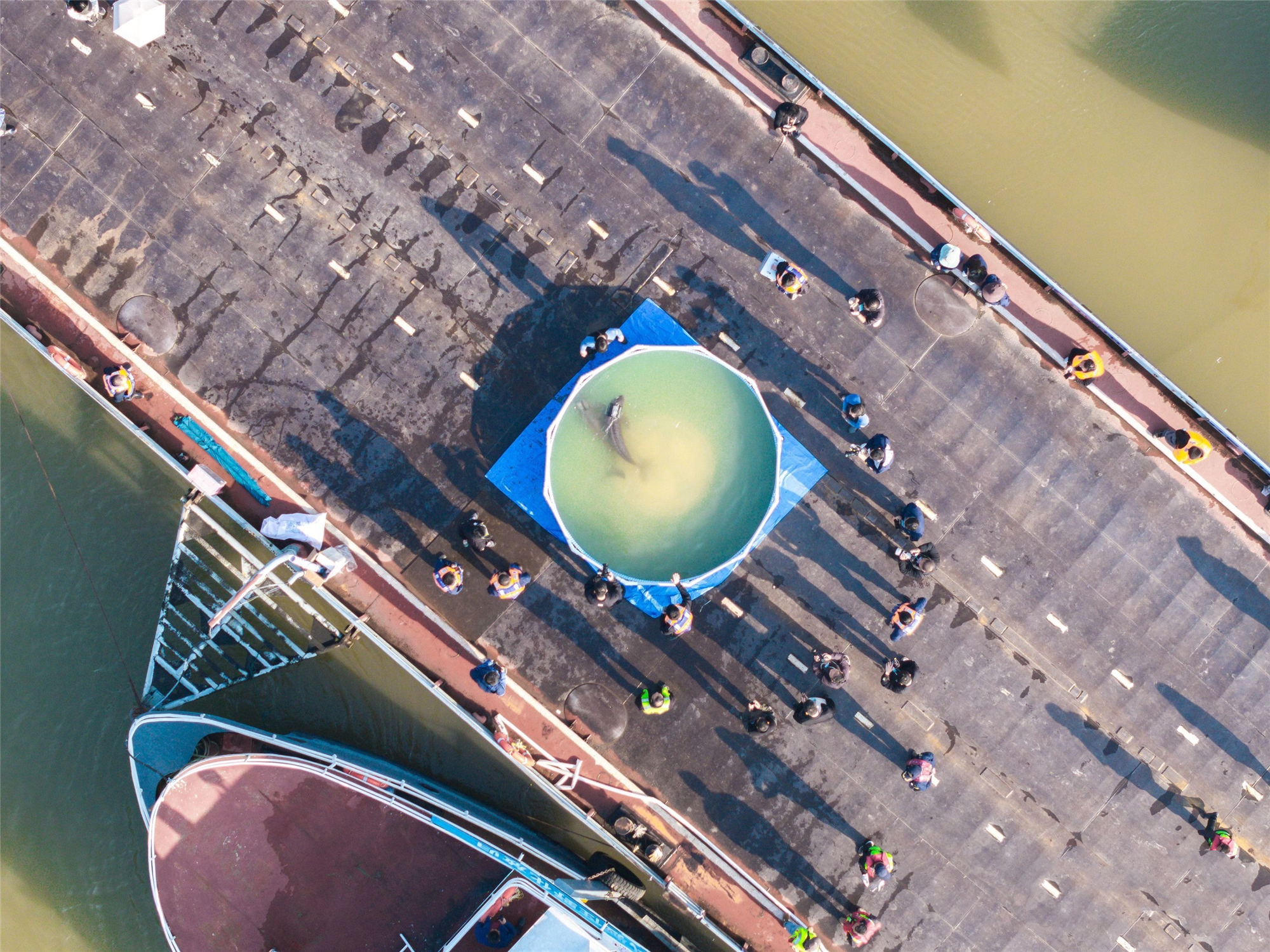 兩只長(zhǎng)江江豚回歸長(zhǎng)江前,在駁船上的“舒緩池”中游弋