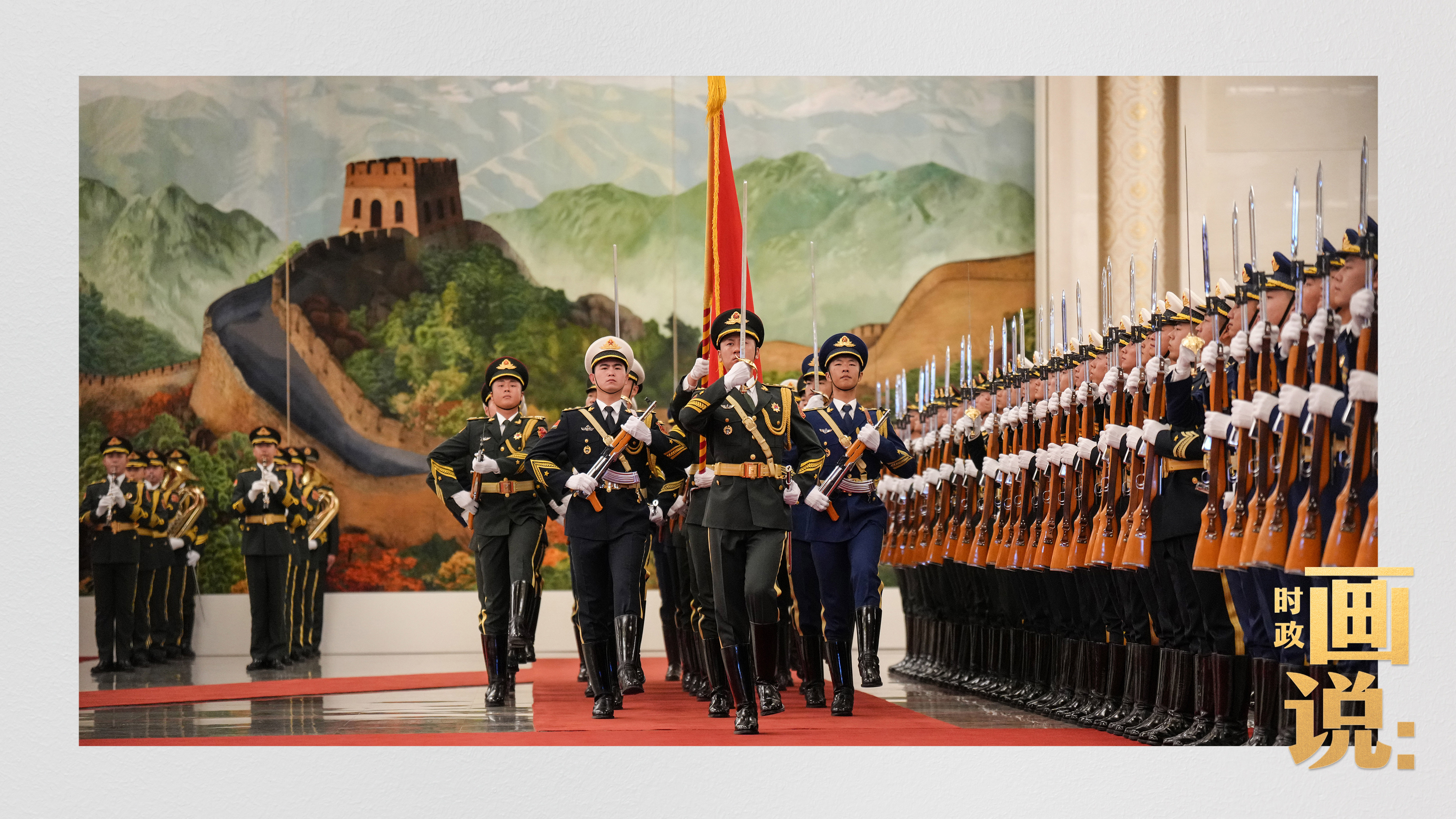 △馬克龍?jiān)诹?xí)近平陪同下檢閱中國人民解放軍儀仗隊(duì)并觀看分列式