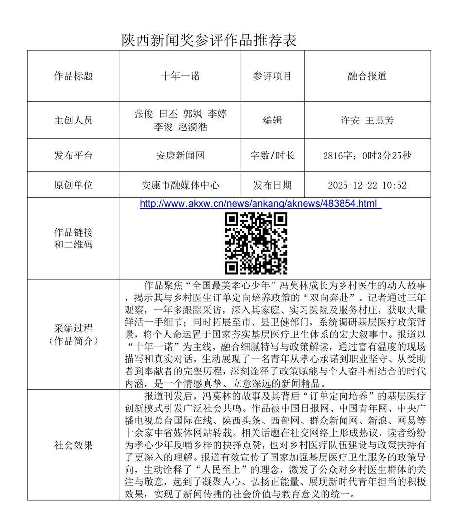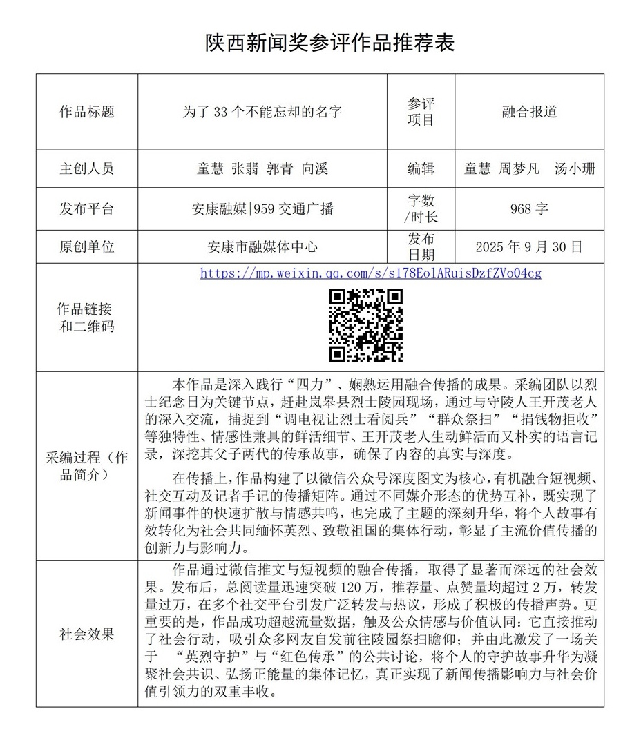根據(jù)《陜西新聞獎(jiǎng)、陜西省優(yōu)秀新聞工作者評(píng)選辦法》和《關(guān)于開展2025年度陜西新聞獎(jiǎng)融合報(bào)道、應(yīng)用創(chuàng)新和新媒體新聞專欄作品推優(yōu)工作的通知》要求,經(jīng)個(gè)人申報(bào)、部門推薦和中心編委會(huì)嚴(yán)格篩選,對(duì)以下3件2025年度陜西新聞獎(jiǎng)融合報(bào)道、應(yīng)用創(chuàng)新、新媒體新聞專欄參評(píng)作品進(jìn)行公示。(作品推薦表附后)