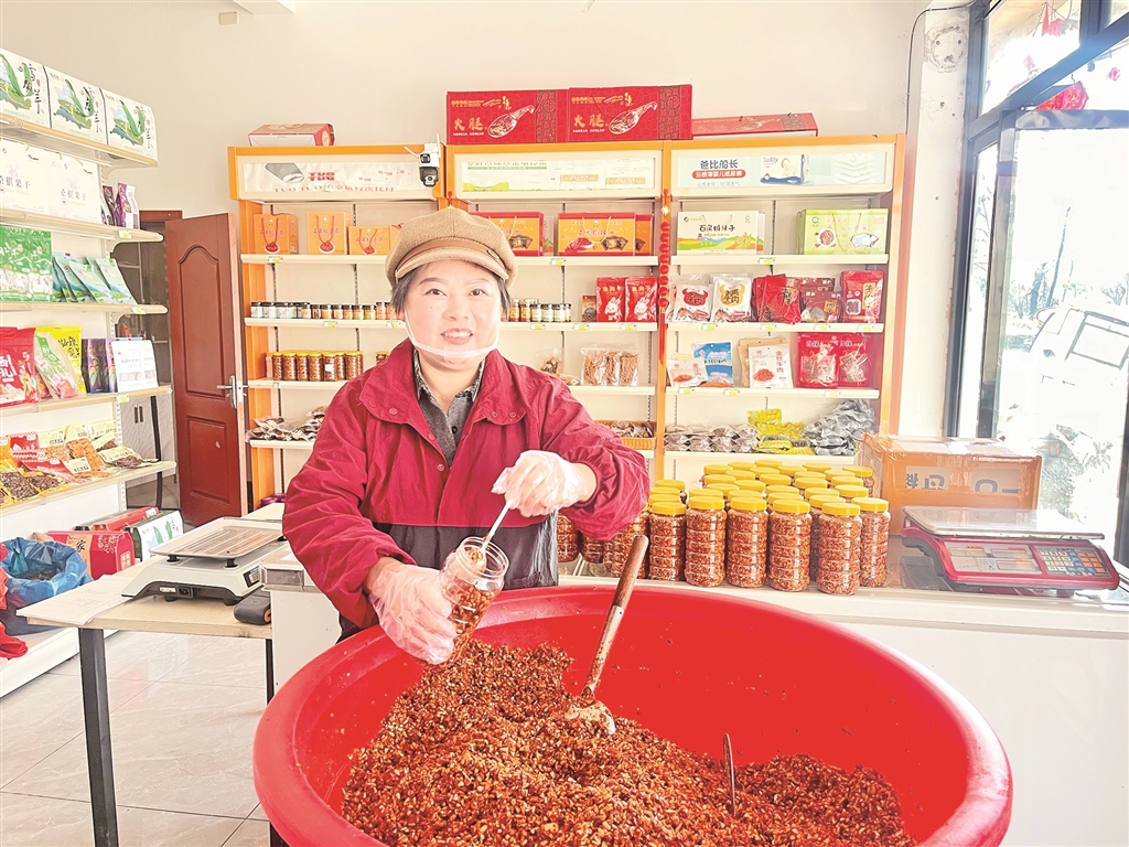 生意有了起色,丈夫的身體也逐漸康復(fù),生活終于重新亮堂起來。作為鎮(zhèn)人大代表,劉小洪深知,一人富不算富,大家富才是真的富。她主動分享直播帶貨經(jīng)驗(yàn),帶動周邊村民參與特產(chǎn)加工和網(wǎng)絡(luò)銷售。她優(yōu)先聘請村里的留守婦女和困難家庭來幫忙,手把手教她們技術(shù)。為了保證產(chǎn)品的純正鄉(xiāng)味,她堅持從本村及周邊村采購黃豆、辣椒、野油菜、干豇豆等原材料,平均每年收購約1萬公斤黃豆、2000余公斤辣椒、2000余公斤野油菜及干豇豆,讓鄉(xiāng)親們的農(nóng)產(chǎn)品有了穩(wěn)定銷路,也變成了實(shí)實(shí)在在的收入。