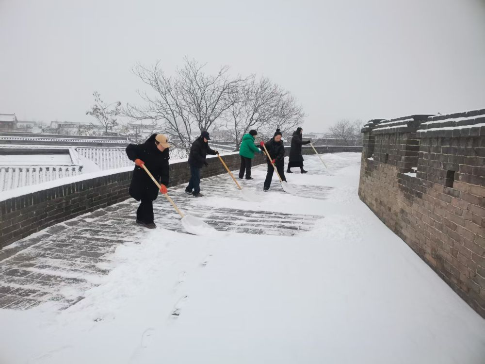 清晨6點(diǎn),平遙古城的城墻上已是一番忙碌景象。全程6公里多的環(huán)線(xiàn)上,工作人員手持掃帚、鏟子,正細(xì)心地清掃青磚上的積雪。