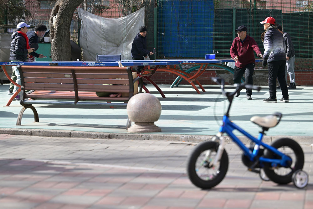 社區(qū)內(nèi),利用樓群間空地設(shè)置的乒乓球臺(tái)等健身設(shè)施為附近的老年居民提供了便捷的健身場(chǎng)所(2月10日攝)。
