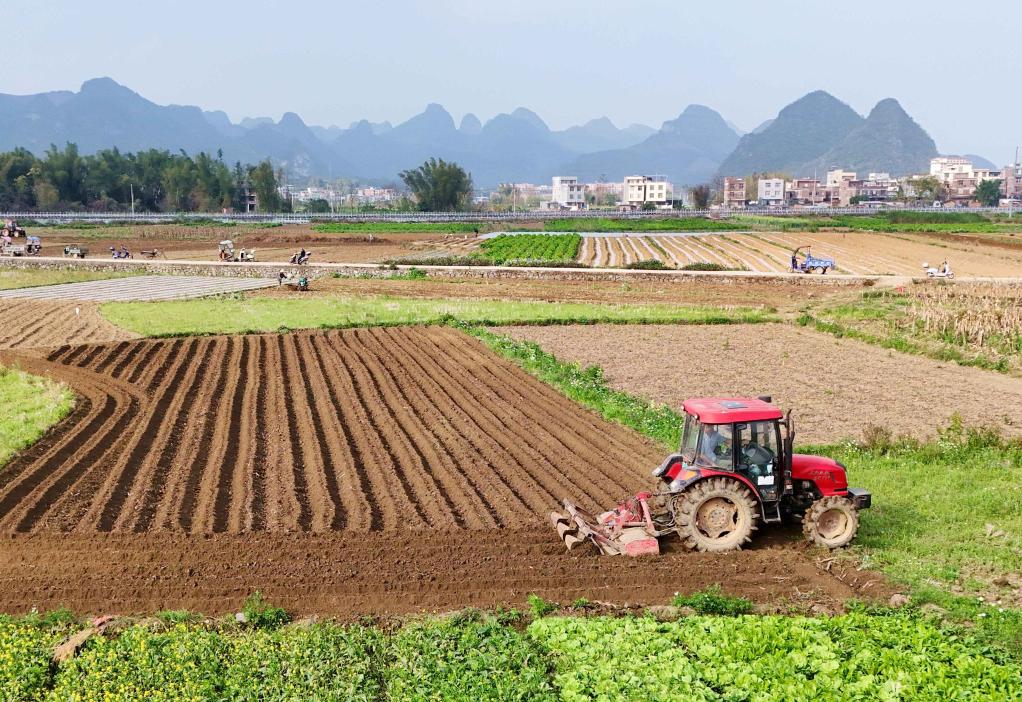 近日,廣西來賓市忻城縣城關(guān)鎮(zhèn)都樂村農(nóng)民駕駛農(nóng)機在翻耕田地,準(zhǔn)備種植玉米(無人機照片)。一年之計在于春,各地人們忙著翻耕土地、培育秧苗、檢修農(nóng)機、裝運化肥,為春耕生產(chǎn)做準(zhǔn)備。新華社發(fā)(樊紹光 攝)