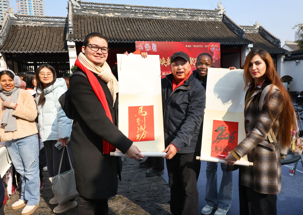 2月12日,“門煥新顏·聯(lián)聚萬家”第二十一屆老西門春聯(lián)大會在上海文廟拉開帷幕。來自巴西的留學(xué)生愛德華(前左)在展示他獲贈的馬年主題書法作品。新華社記者 方喆 攝