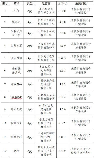 四、初念、零零汽等12款A(yù)pp未提供有效賬號(hào)注銷(xiāo)途徑或?yàn)橛脩糇N(xiāo)賬號(hào)設(shè)置不合理?xiàng)l件(詳見(jiàn)下表)。