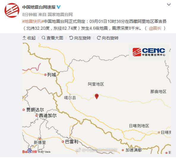 西藏阿里革吉縣發(fā)生4.6級(jí)地震 震源深度8千米
