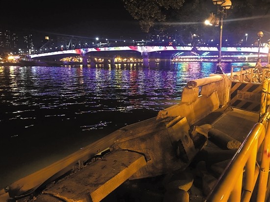 珠江一機(jī)船撞上岸 花崗巖欄桿斷5米