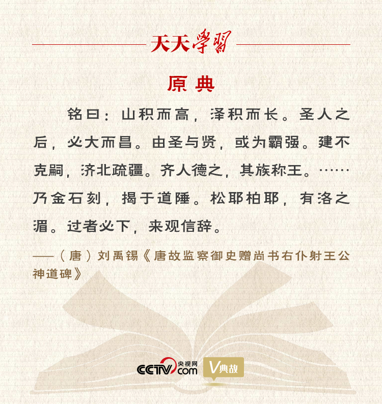 《唐故監(jiān)察御史贈尚書右仆射王公神道碑》為唐代詩人劉禹錫所撰,碑主為王俊,碑文中有韻的部分為銘文。“山積而高,澤積而長”出自該碑銘文起首,采用了比興手法。意思是,山是由土石日積月累才高聳起來的,水是由點(diǎn)滴積聚才長流不斷的。兩個(gè)“積”字,突出了量變的作用。不斷積累,山可高,水可長,點(diǎn)滴努力,鑄就成功。