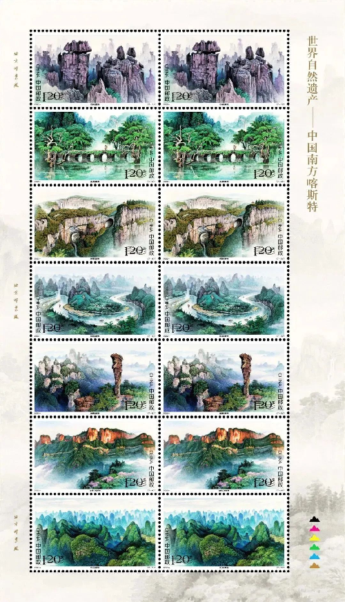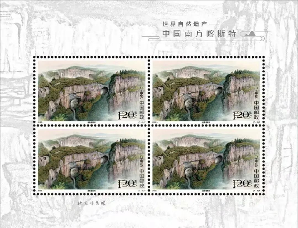2022年新郵《世界自然遺產(chǎn)——中國南方喀斯特》特種郵票擬為每處景觀單獨(dú)發(fā)行版式二,全套共7枚小版張,這在中國郵票發(fā)行史上尚屬首次。此套郵票是今年枚數(shù)最多的大套票,將“南方喀斯特世界遺產(chǎn)申報”的第一期和第二期共7個地區(qū)的喀斯特打包重新一并發(fā)行。