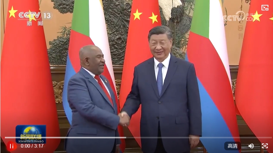 習近平贊賞科摩羅擔任非盟輪值主席國期間發(fā)揮的積極作用,指出中方愿同科方秉持和平共處五項原則,在非盟、阿拉伯國家聯(lián)盟、伊斯蘭合作組織框架內(nèi)加強溝通協(xié)作,壯大“全球南方”新興力量,推動全球治理體系改革。