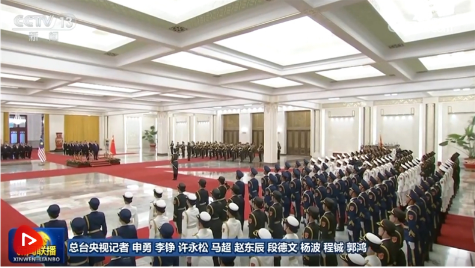 天安門廣場(chǎng)鳴放21響禮炮,禮兵列隊(duì)致敬。兩國(guó)元首登上檢閱臺(tái),軍樂團(tuán)奏中馬兩國(guó)國(guó)歌。易卜拉欣在習(xí)近平陪同下檢閱中國(guó)人民解放軍儀仗隊(duì),并觀看分列式。