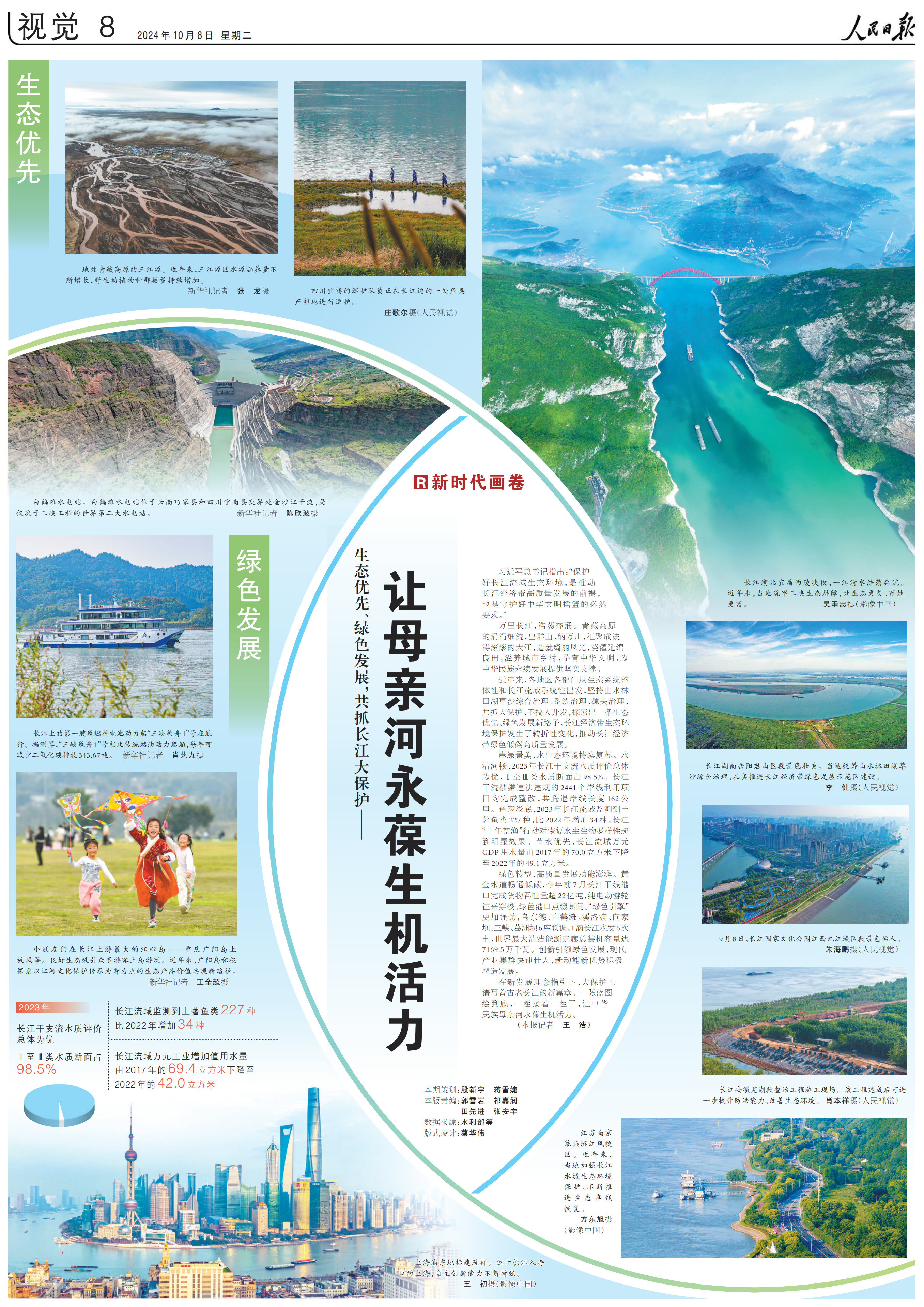 岸綠景美,水生態(tài)環(huán)境持續(xù)復(fù)蘇。水清河暢,2023年長江干支流水質(zhì)評(píng)價(jià)總體為優(yōu),Ⅰ至Ⅲ類水質(zhì)斷面占98.5%。長江干流涉嫌違法違規(guī)的2441個(gè)岸線利用項(xiàng)目均完成整改,共騰退岸線長度162公里。魚翔淺底,2023年長江流域監(jiān)測到土著魚類227種,比2022年增加34種,長江“十年禁漁”行動(dòng)對(duì)恢復(fù)水生生物多樣性起到明顯效果。節(jié)水優(yōu)先,長江流域萬元GDP用水量由2017年的70.0立方米下降至2022年的49.1立方米。hk7安康新聞網(wǎng)