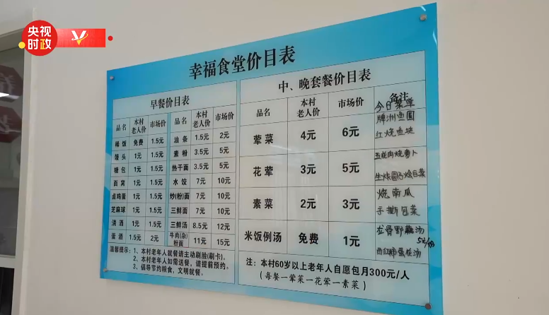 隨行記者用鏡頭記錄了這樣一幕:站在養(yǎng)老服務驛站幸福食堂價目表前,總書記仔細察看當天菜單。菜單中既有種類豐富的早餐,也有六菜兩湯的中、晚套餐,葷素搭配、營養(yǎng)均衡;村中老人用餐還有特別優(yōu)惠,另外還有免費的稀飯和米飯例湯……