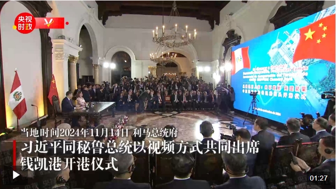 當(dāng)?shù)貢r(shí)間11月14日晚,國(guó)家主席習(xí)近平同秘魯總統(tǒng)博魯阿爾特在利馬總統(tǒng)府以視頻方式共同出席錢凱港開港儀式。