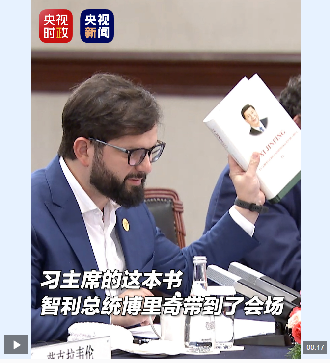 當(dāng)?shù)貢r(shí)間11月15日下午,中國代表團(tuán)駐地會見廳,智利總統(tǒng)博里奇在見到習(xí)近平主席時(shí),特地帶來了他在圣地亞哥國際書展上看到的《習(xí)近平談治國理政》一書。
