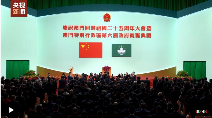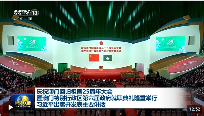 慶祝澳門回歸祖國(guó)25周年大會(huì)暨澳門特別行政區(qū)第六屆政府就職典禮20日上午在澳門東亞運(yùn)動(dòng)會(huì)體育館隆重舉行。中共中央總書記、國(guó)家主席、中央軍委主席習(xí)近平出席并發(fā)表重要講話。他指出,澳門回歸祖國(guó)25年來,具有澳門特色的“一國(guó)兩制”實(shí)踐取得巨大成功,澳門發(fā)生翻天覆地的變化,國(guó)際影響力大幅提升。他希望,新一屆澳門特別行政區(qū)政府團(tuán)結(jié)帶領(lǐng)社會(huì)各界,搶抓機(jī)遇、銳意改革、擔(dān)當(dāng)作為,更好發(fā)揮“一國(guó)兩制”制度優(yōu)勢(shì),不斷開創(chuàng)“一國(guó)兩制”事業(yè)高質(zhì)量發(fā)展新局面。
