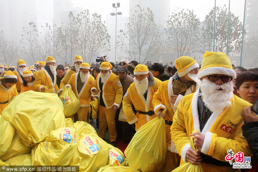 2013年12月24日,鄭州市。圣誕老人們著黃裝開送禮動(dòng)員大會(huì)。200多名換黃裝圣誕老人亮相鄭州街頭。圖片作者:平偉/CFP4ce安康新聞網(wǎng)