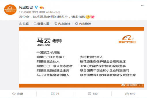 在宣布馬云一年后卸任董事局主席后,阿里巴巴官微隨即發(fā)布馬云新名片,上面介紹了馬云全新的職務(wù)和身份。阿里巴巴相關(guān)負(fù)責(zé)人向藍(lán)鯨TMT表示,此名片信息是真實(shí)的……