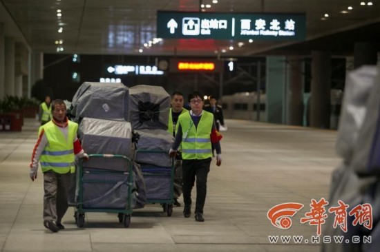 11月11日11時18分,80件累計1000公斤印有“中鐵快運”字樣的包裹箱“坐”上了G1294次高鐵列車,從西安北一路疾馳向大連北駛去。這是今年“雙11”電商黃金周期間西安鐵路局新增大連方向的首趟高鐵快運列車。yrw安康新聞網(wǎng)