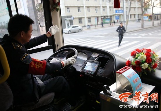 800路公交車司機(jī)趙紅權(quán)師傅在在斑馬線前停車讓行人,并揮手示意讓行人放心通行。 華商報(bào)記者 鄧小衛(wèi) 攝