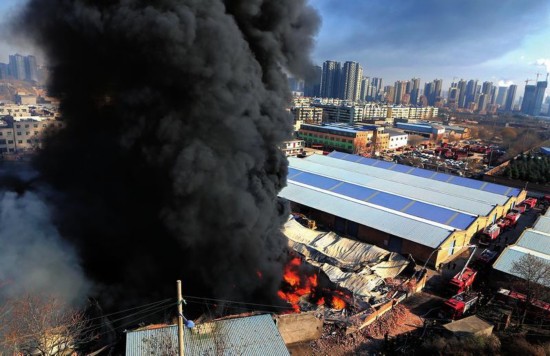 “大約在6點多吧,天還沒亮,我看到起煙了,剛一推開門就受不了,因為煙太大了!眰}庫與村民自建的樓房,最近處不到10米遠,一位女房東驚魂未定地告訴記者,這排倉庫的面積大約有20畝,臨近年關(guān),儲存的貨物很多,主要是生活用品和塑膠制品,“每天都能看到貨車進進出出!