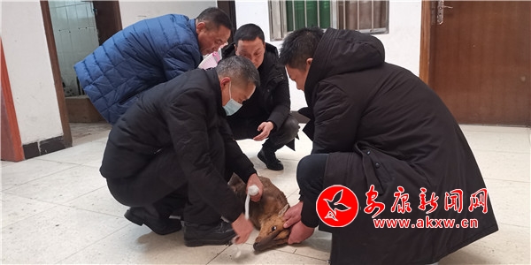 接到報(bào)告后,大竹園鎮(zhèn)派出所、農(nóng)綜站、綜合執(zhí)法辦公室三部門聯(lián)合出動(dòng),迅速趕往現(xiàn)場,通過現(xiàn)場比對鑒定,發(fā)現(xiàn)這只小動(dòng)物是國家二級野生保護(hù)動(dòng)物麂子。為穩(wěn)定麂子傷情,工作人員現(xiàn)場進(jìn)行了傷口處理,并將其帶回鎮(zhèn)農(nóng)綜站邀請獸醫(yī)進(jìn)行診治。