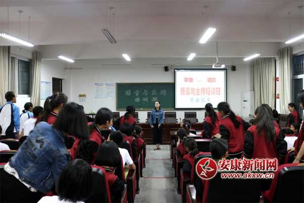 在舉行了簡短的開班儀式后,學(xué)校聘請的漢陰電視臺主播楊晶晶進行了第一次培訓(xùn)。40多名播音主持愛好者參加了培訓(xùn)。培訓(xùn)中楊老師主要和同學(xué)們分享主持人臺風(fēng)和態(tài)勢語等方面的知識。楊老師惟妙惟肖地對主持人如何做到走姿站姿大方得體、微笑眼神交流傳神、肢體語言表情達意等向同學(xué)們進行了細致講解。在理論講解的同時,又與同學(xué)們進行了現(xiàn)場互動實踐練習(xí),同學(xué)們個個聚精會神,積極參與互動。楊老師幽默風(fēng)趣的授課贏得了陣陣掌聲,同學(xué)們在輕松愉快的課堂上既學(xué)到了專業(yè)知識,又在實踐中得到了專業(yè)技巧的點撥。