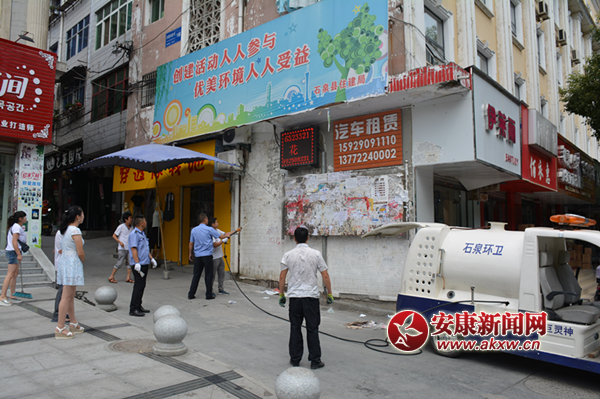 7.1前夕,縣住建局、城管大隊(duì)聯(lián)合環(huán)衛(wèi)所組織全體執(zhí)法人員走上街頭并出動(dòng)灑水車,強(qiáng)力清污車對(duì)全城人行道、天橋、沿街的“牛皮癬”進(jìn)行清理,規(guī)范市場(chǎng)及占道經(jīng)營(yíng),以此拉開了“百日整治”的序幕。