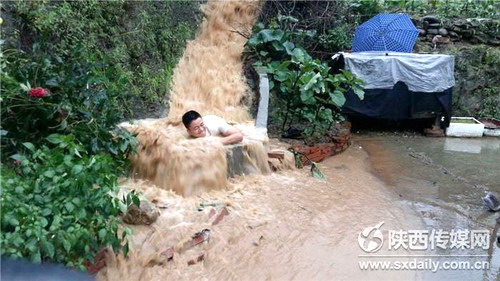 石泉突發(fā)汛情 社區(qū)干部跳入排水渠通下水